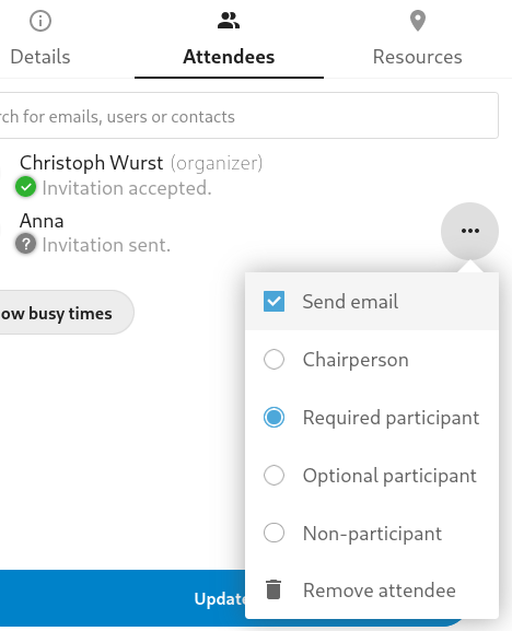 You may add attendees to an event to let them know they’re invited. They will receive an email invitation and will be able to confirm or cancel their participation to the event. Attendees may be other users on your Nextcloud instances, contacts in your address books and direct email addresses. You may also change the level of participation per attendees, or disable the email information for a specific attendee.