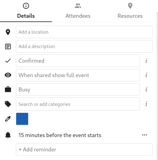 When adding other Nextcloud users as attendees to an event, you may access their free-busy information if available, helping you determine when the best time slot for your event is. Set your working hours to let others know when you are available. Free-busy information is only available for other users on the same Nextcloud instance.