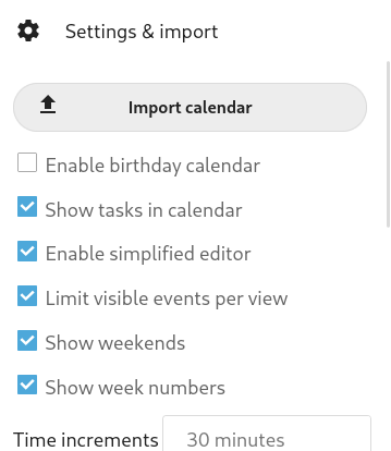 + Import Calendaryou can select one or more calendar files from your local device to upload.The upload can take some time and depends on how big the calendar you import is.